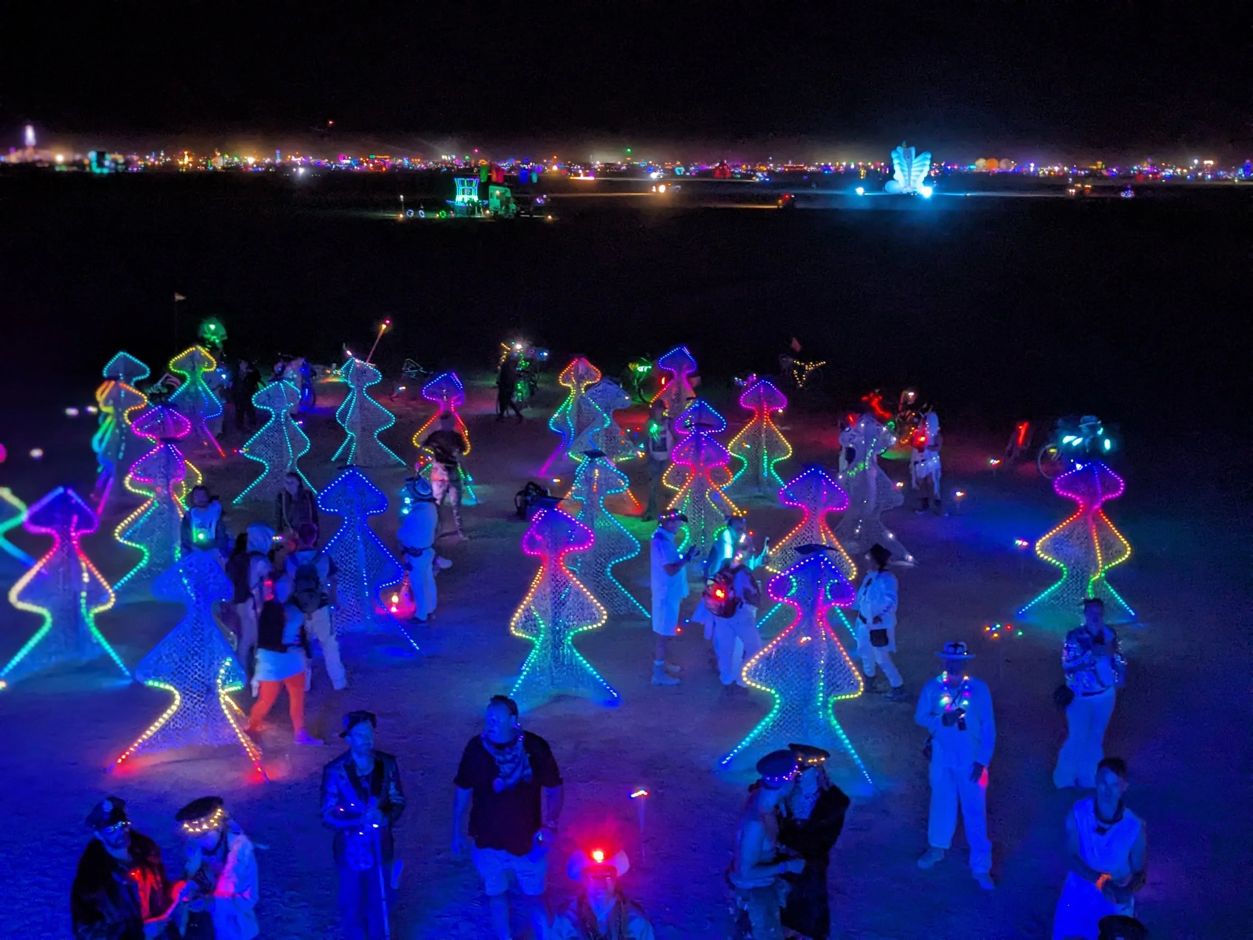 When every tree is activated, the forest bursts into a synchronized light show you create together. The magic is supported (quietly) by low-voltage LEDs on a wireless mesh network, powered by rechargeable batteries, and solar panels.